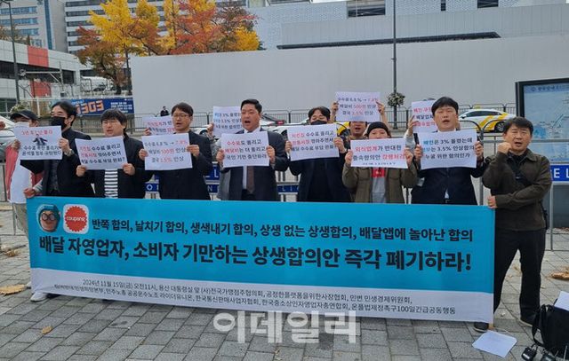 전국가맹점주협의회 등 단체들은 15일 오전 서울 용산구 대통령실 앞에서 상생협의체 결정을 규탄하는 기자회견을 진행했다. 김진우 전국가맹점주협의회 공동의장은 “수수료는 내리고 배달비는 올려서 결국 더 부담이 증가했는데 이건 조삼모사일 뿐”이라며 “당초 상생협의체의 목적은 배달의민족(배민)의 9.8% 수수료 기습 인상에 따른 것이었는데, 인상 전 6.8%에 비교하면 결과적으로 1%의 수수료 인상과 500원 배달비 인상이 이뤄진 것”이라고 비판했다.