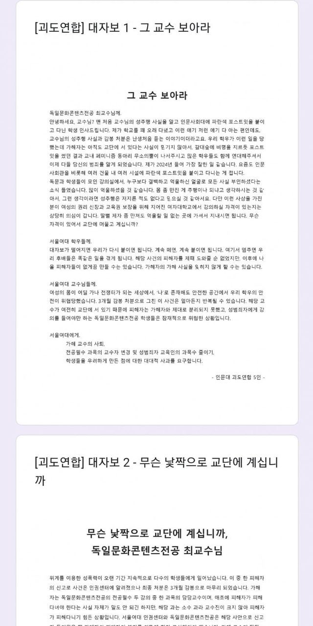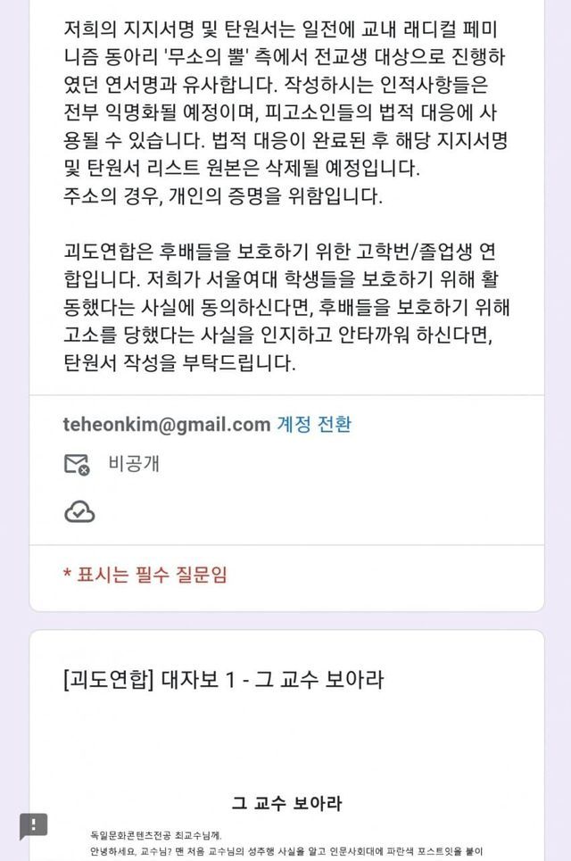 해당 교수를 고발하는 탄원서와 서명서를 보면