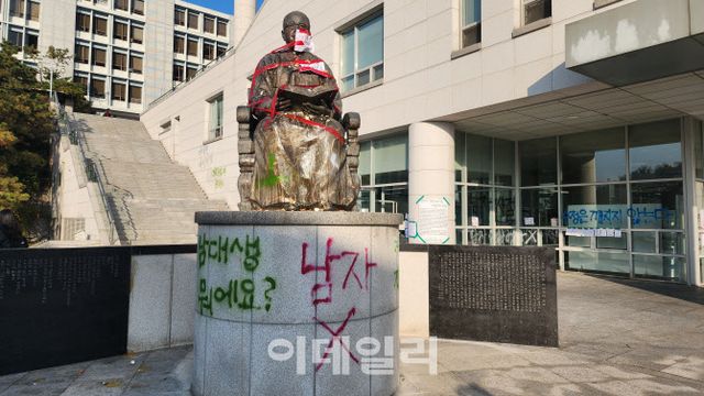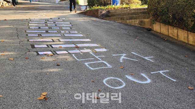 15일 오후 대규모 집회를 앞두고 방문한 성신여대 캠퍼스는 입구부터 ‘반대’의 흔적이 가득했다. 정문에서 본관으로 오르는 언덕길에는 ‘남자 OUT’ ‘공학 반대’ 등의 문구가 스프레이로 칠해져 있었고, 캠퍼스 곳곳에는 남학생 입학을 반대하는 대자보와 종이가 붙어 있었다. 대학본부 건물 앞으로는 침묵 시위를 뜻하는 조화와 학교 점퍼가 줄을 지어 놓여 있었다.