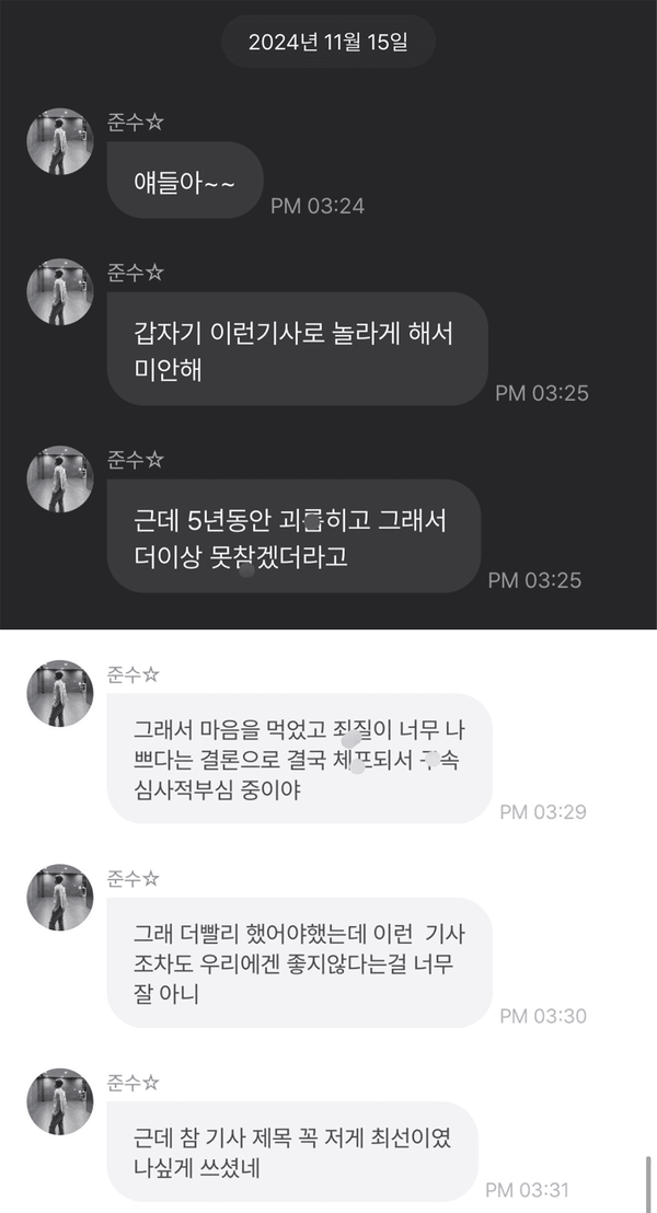 김준수는 11월 15일 팬 소통 앱 프롬을 통해 "얘들아~ 갑자기 이런 기사로 놀라게 해서 미안해. 근데 5년 동안 괴롭히고 그래서 더이상 못 참겠더라고. 그래서 마음을 먹었고 죄질이 너무 나쁘다는 결론으로 결국 체포돼서 구속 적부심 심사 중이야. 그래. 더 빨리 했어야 했는데 이런 기사조차도 우리에겐 좋지 않다는 걸 너무 잘 아니. 근데 참 기사 제목 꼭 저게 최선이었나 싶게 쓰셨네"라고 밝혔다.