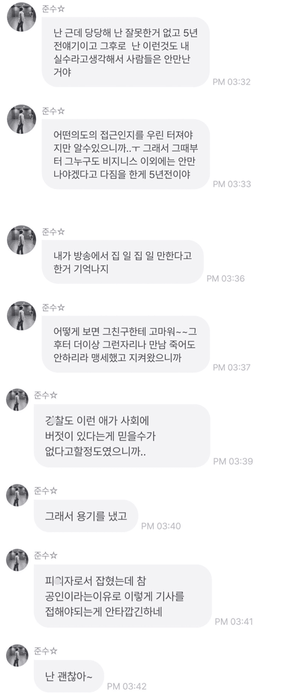 그러면서 김준수는 "난 괜찮아~ 너희들에게 뭐가 됐든 미안한 것뿐이야. 좋은 소식들만 접하게 하고 싶은데 그러지 못해서 미안해. 근데 나 말고도 6명 이상의 피해자가 더 있다는 걸 듣고 더이상 참을 수 없었어. 나 한다면 하는 놈이잖아"라며 팬들에게 사과했다.