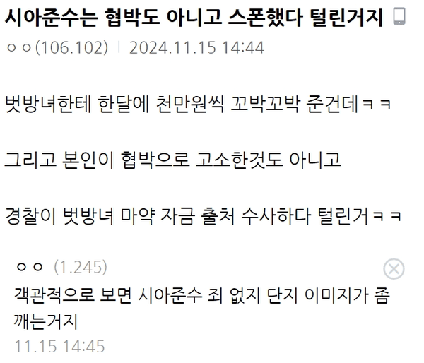 또 다른 글에서는 김준수가 협박도 아니고 스폰을 했다가 돈을 뜯겼다는 글도 올라와 있다.