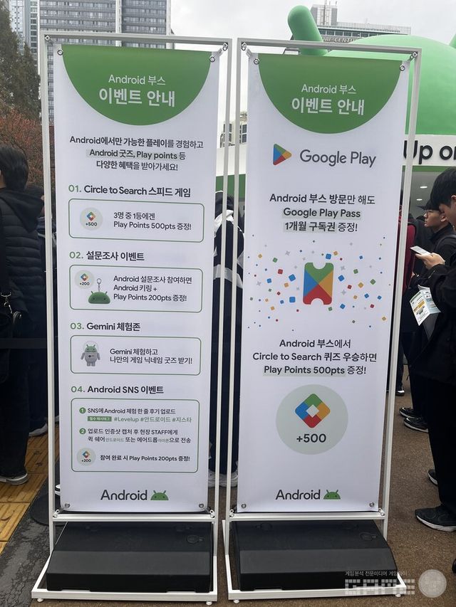 '구글플레이'는 'Circle to Search' 스피드 게임을 통해 플레이 포인트를 지급하고, 설문조사 이벤트를 완료하면 안드로이드 로봇 모양의 인형을 증정한다. 이 외에도 Gemini 체험존에서 닉네임 굿즈를, SNS 이벤트를 통해 추가 플레이포인트를 얻을 수 있다. 증정하는 굿즈들의 종류가 다양해서인지 대기줄이 끝없이 채워져 있었다.