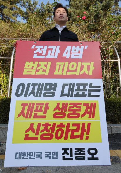 진 위원은 15일 자신의 SNS에 “조금 전 피고인 이재명의 선거법 1심 재판 결과 ‘징역 1년 집행유예 2년’으로 당선무효 및 피선거권 박탈 형이 나왔다”며 “이재명 이름 앞에 붙일 수 있는 것은 전과(前科)밖에 없다”고 밝혔다.