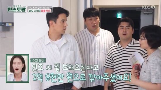 부동산 관계자는 "전세가는 2억 9천만 원인데, 집주인 분이 장민호 씨가 집 보러 오신다고 하니까 천만 원을 깎아주시더라"며 2억 8천만 원이라고 얘기했다.