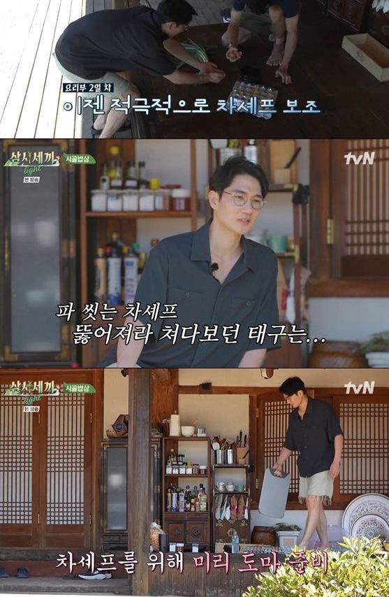 이때 엄태구는 달걀 껍질을 버린다거나 대파를 썰 도마를 미리 세팅하는 등 차승원의 보조 셰프로서 역할을 톡톡히 해냈다. 유해진은 마당에 나와 가마솥의 밥을 덜어내고, 소량의 밥만 남겨놓은 다음 물을 넣고 끓였다.