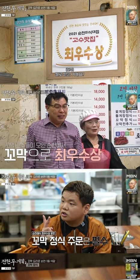 이어 순천미식대첩 고수 맛집 최우수상 상패를 발견한 전현무는 "뭘로 받은 거냐"라며 사장님 내외 분께 질문했다.