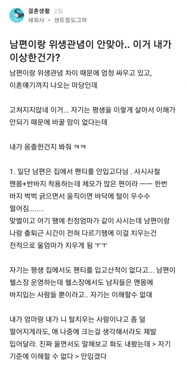 남편이랑 위생관념이 안 맞아.. 내가 이상한 건가?,,