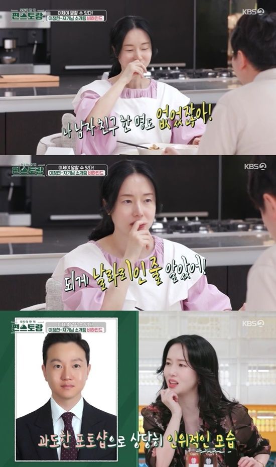 이어 영상을 통해 남편의 과거 사진이 공개됐고, 이정현은 "노는 사람처럼 보여서 싫었다. 옛날 제비족 같지 않냐. 보정을 엄청 한 것 같았다. 왜 그 사진을 줬는지 모르겠다"고 얘기했다.