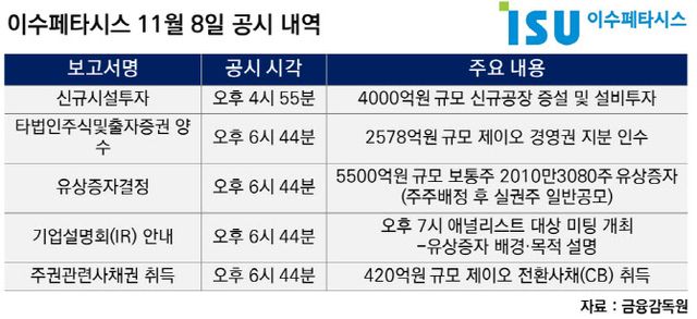 하지만 신규 시설투자 공시 이후 2시간 뒤인 오후 6시 44분, 이수페타시스는 4개의 공시를 연달아 쏟아냈다. 3000억원을 들여 제이오 경영권 지분과 전환사채(CB)를 취득하고, 해당 자금을 조달하기 위해 5498억원 규모 유상증자를 추진한다는 계획이었다. 유상증자 배경은 공시로부터 16분 후에 열릴 오후 7시 애널리스트 대상 미팅에서 설명하겠다는 공시도 함께 나왔다.