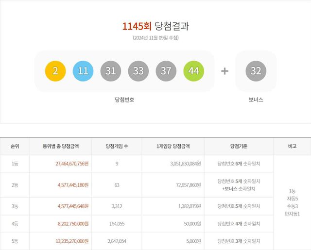 11월 9일 추첨 된 1145회 1등 당첨번호는 '2, 11, 31, 33, 37, 44' 보너스 번호는 '32' 번이다.