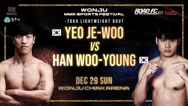 로드FC와 (사)세계격투스포츠협회는 12월 29일 원주 치악체육관에서 원주 MMA 스포츠 페스티벌-굽네 ROAD FC 071을 개최한다. 로드FC 글로벌 토너먼트 결승전이 밴텀급, 라이트급 두 체급으로 진행돼 드디어 우승자를 결정짓는다.