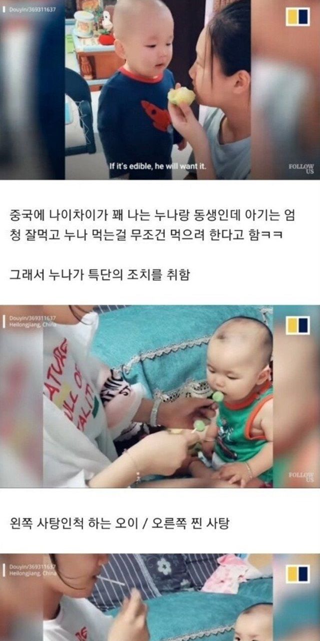 누나꺼 뺏어먹는 아기 동생을 교육하는 누나.