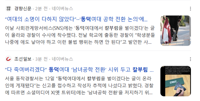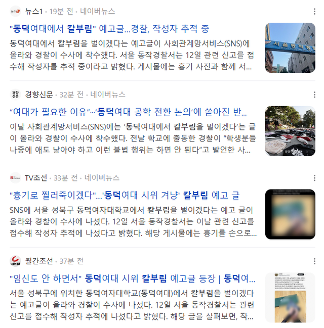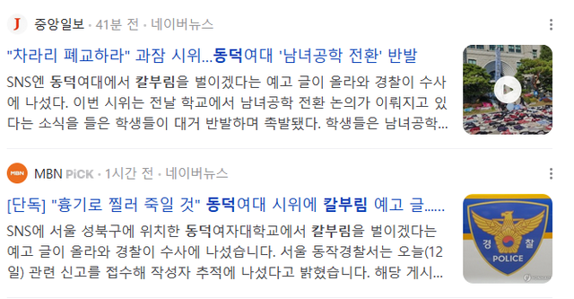 출처 확실하지도 않은 칼부림 예고글 기사가 한시간만에 6개나 올라감 ㅋㅋ