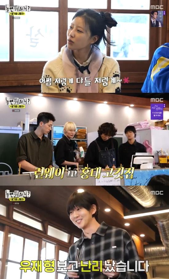 그러면서 오겹살 식당에 대해 "웬만하면 친한 동생 가게 안 가려고 했는데 솔직히 미주 때문에 온 것"이라고 밝혔다. 알고보니 해당 식당은 배우 변우석과 김재영도 왔다 간 맛집. 이에 이미주는 아르배이트생들의 비주얼에 연신 감탄하며 "어쩜 저렇게 다들…. 눈을 뗄 수가 없다"라며 두리번거렸다.