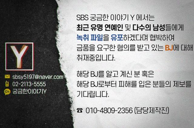 16일 SBS '궁금한 이야기 Y' 측은 공식 계정을 통해 "SBS 궁금한 이야기 Y 에서는 최근 유명 연예인 및 다수의 남성들에게 녹취 파일을 유포하겠다며 협박하여 금품을 요구한 혐의를 받고 있는 BJ에 대해 취재중입니다"라는 게시글을 게재했다.