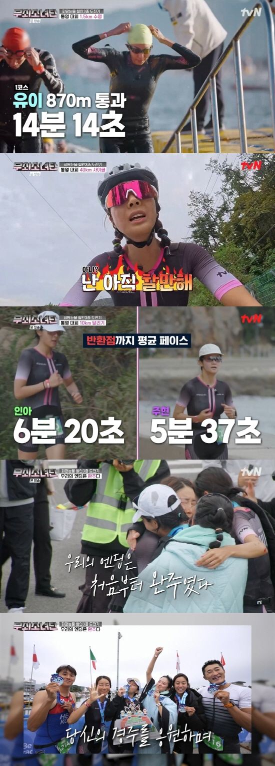 tvN ‘무쇠소녀단’이 어제(16일) 방송을 끝으로 막을 내렸다. 통영 월드 트라이애슬론 컵 완주를 목표로 4개월간 맹훈련했던 진서연, 유이, 설인아, 박주현은 수영 1.5km, 사이클 40km, 달리기 10km 코스 전원 완주에 성공하며 꽉 닫힌 해피엔딩을 선사했다.
