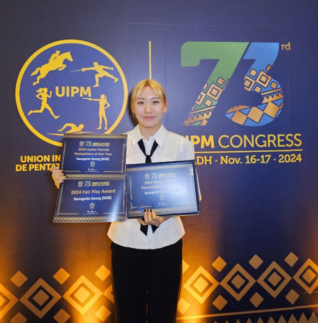 대한근대5종연맹에 따르면 성승민은 지난 16일(한국시간) 사우디아라비아 리야드에서 열린 제73차 UIPM 총회에서 2024 UIPM 올해의 최우수 여자선수 시니어 부문과 주니어 부문, 페어플레이상까지 3개의 상을 수상했다.