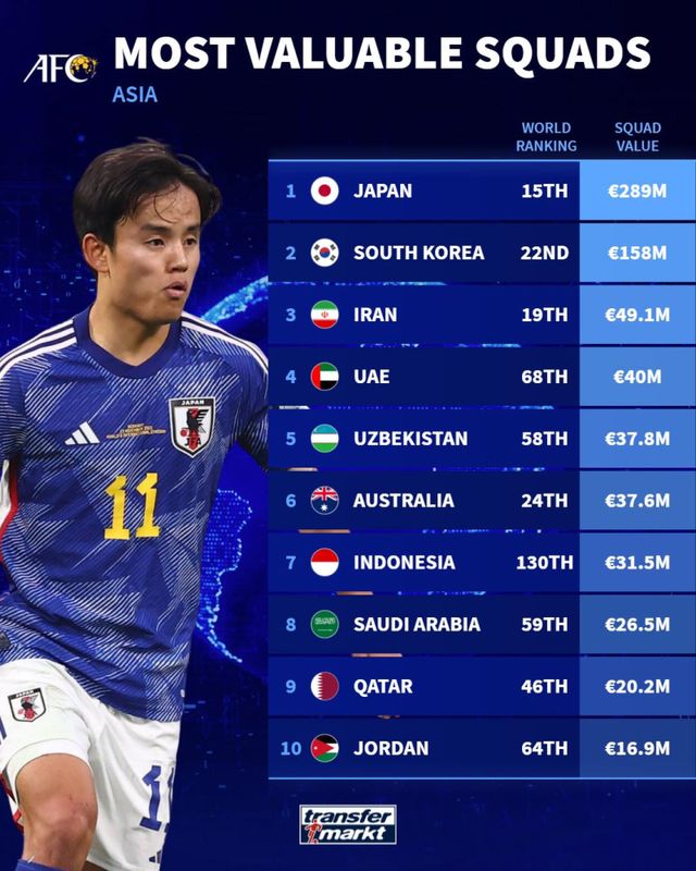 축구 통계 매체 트랜스퍼마르크트는 16일(한국시간) AFC 소속 축구대표팀의 몸값을 갱신해 공개했다. 매체는 일정 주기별로 팀, 선수 등에 대한 가치를 갱신하는데, 이번에는 AFC 소속 국가대표팀과 선수가 그 대상이 됐다.