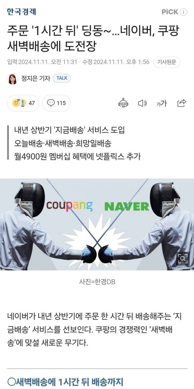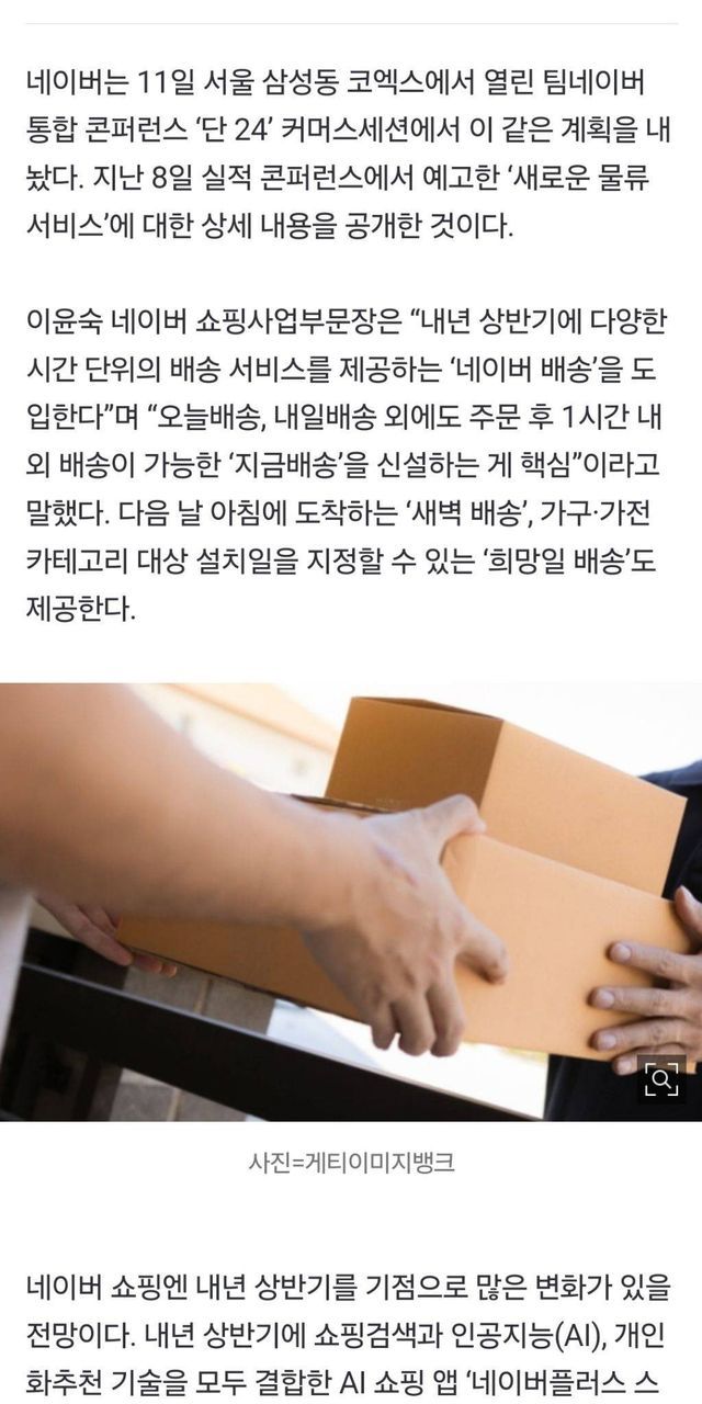 네이버가 내년 상반기에 주문 한 시간 뒤 배송해주는 ‘지금배송’ 서비스를 선보인다. 쿠팡의 경쟁력인 ‘새벽배송’에 맞설 새로운 무기다. ○새벽배송에 1시간 뒤 배송까지 네이버는 11일 서