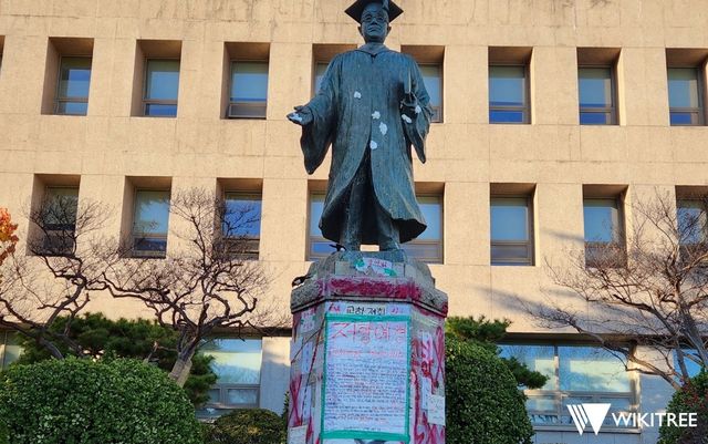 동덕학원 설립자 고(故)조동식 선생 동상도 이물질과 휴지, 대자보 등으로 얼룩졌다. 어디를 가도완전히 낙서 천국이었다.