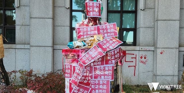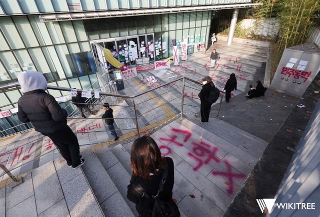 기념관 바닥에는 '명애로운 죽음' '총장사퇴' ‘공학 반대’, ‘민주동덕은 죽었다’, ‘여성교육 지켜내자’ 등 문구가 빨간 래커(분사하는 페인트)칠 낙서로 흩뿌려져 있었다.