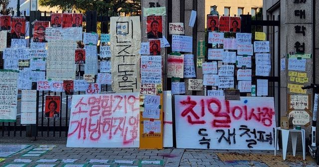 공학반대 문구가 빼곡히 들어선 동덕여대 정문 / 이범희 기자