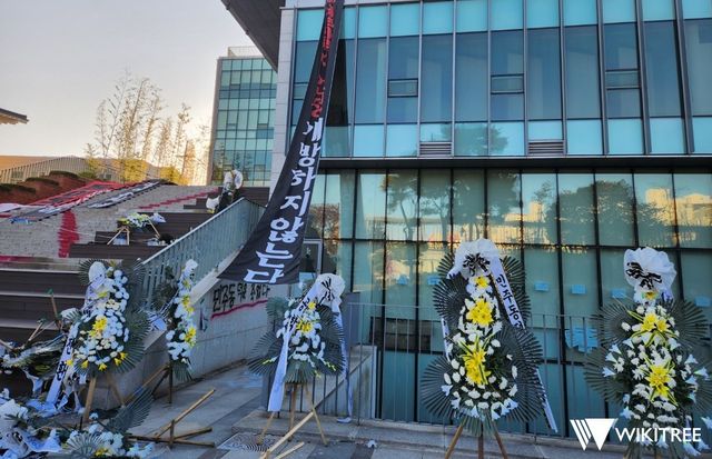 100주년기념관 앞에 공학 전환을 반대하는 내용이 담긴 근조화환들이 늘어서있다. / 이범희 기자
