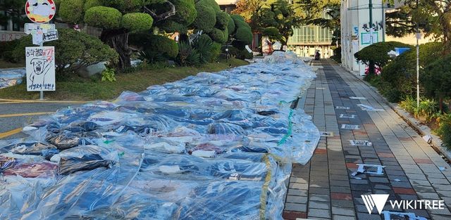 항의의 의미로 학생들은 본관 앞에 학과 점퍼(과잠) 400여벌을 놨다. / 이범희 기자