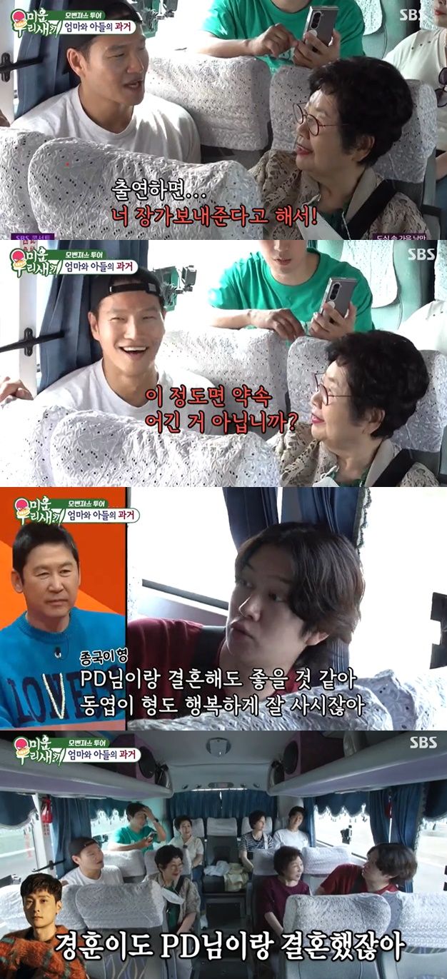 이에 김종국의 어머니는 "출연하면 너 장가 보내준다고 했다"며 출연 조건이 PD의 여자 소개였다고 전했다.