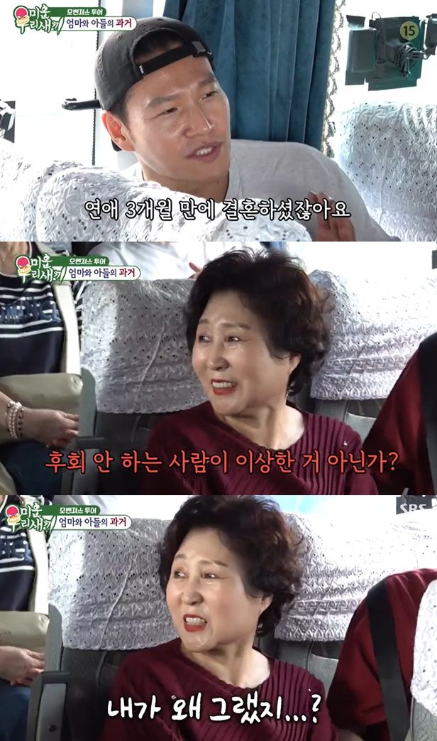 연애 3개월 만에 결혼해서 후회하지 않냐는 질문에 김희철의 어머니는 "후회 안 하는 사람이 이상한 거 아닌가? 진짜 좋다가도 살다 보면 '내가 왜그랬지' 한다"라고 솔직한 마음을 드러냈다.