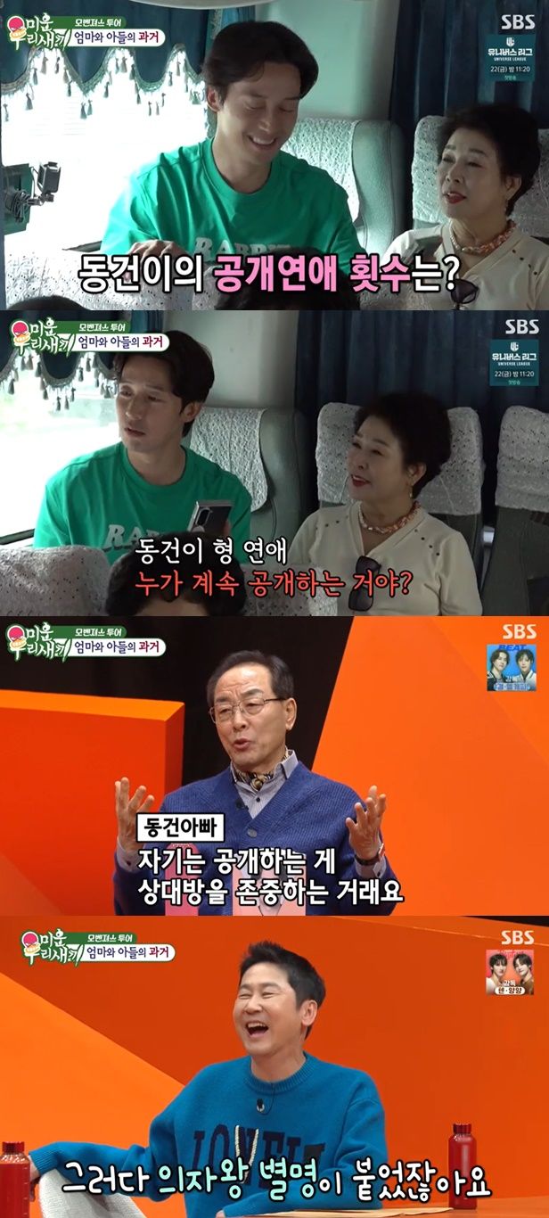 이동건의 부친은 "쟤는 사겼다하면 바로 공개한다. '연예인인데 왜 그걸 공개해. 비밀로 해야지' 했는데 자기는 공개하는 게 상대방을 존중하는 거라고 했다"며 "그러다 의자왕 별명이 붙었다. 자기는 솔직했을 뿐인데 왜 의자왕이냐며 항변하고 있다"고 말했다.