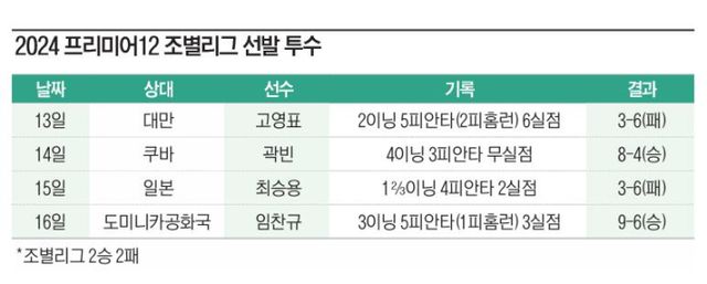 선발 투수는 대회 시작 전부터 대표팀의 약점이었다. 문동주(한화 이글스) 이의리(KIA 타이거즈) 원태인(삼성 라이온즈) 등 KBO리그를 대표하는 주요 영건 에이스들이 부상 문제로 최종 엔트리(28명)에서 빠졌기 때문이다. 한국야구위원회(KBO) 전력강화위원회와 대표팀 코치진은 투수 엔트리(14명)의 대부분을 불펜 투수에게 할애했다. 붙박이 선발 투수는 3명(곽빈·고영표·임찬규)에 불과했다. 선발의 약점을 강한 불펜으로 극복할 계획이었다. 하지만 예상을 벗어난 선발 투수의 집단 부진이 반복하면서 마운드 운영에 계산이 서지 않았다. 초반 실점한 뒤 끌려가는 경기 양상이 반복됐다.