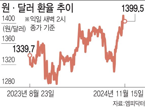 17일 서울외국환중개에 따르면 전날 새벽 2시 뉴욕차액결제선물환(NDF) 시장에서 거래된 원·달러 1개월물은 1399.5원에 최종호가됐다. 환율은 지난 14일 장중 1411.10원을 기록하며 연중 최고가는 물론 52주 최고가를 경신했다. 같은날 달러인덱스 역시 107을 넘으면서 52주 최고가를 새로 썼다. 정규장 종가(오후 3시 30분) 기준으로 지난 12~14일 사흘간 1400원대에서 거래를 마감하면서 트럼프 2기를 맞아 ‘1달러=1400원’이 ‘뉴노멀’이 되는 것 아니냐는 우려의 목소리도 높아졌다.