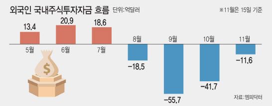 국내 주식시장에서의 외국인 자금 이탈은 지난 8월부터 이어지고 있다. 한국은행에 따르면 외국인의 국내 증권투자자금 중 주식자금은 △8월 18억5000만달러 △9월 55억7000만달러 △10월 41억7000만달러 순유출됐다.