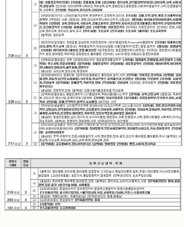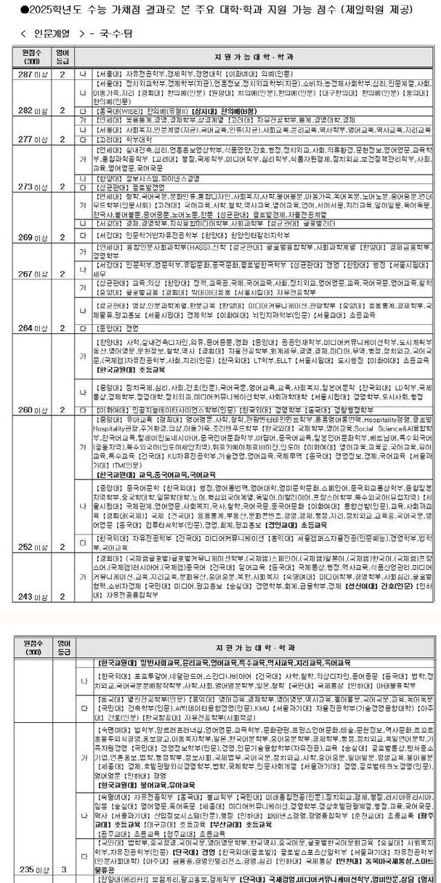 ▲서울 등 주요 대학별 지원 가능점수는 서울대 자유전공, 경제, 경영과 이화여대 의예(인문)는 287점 이상이 필요하며, 서울대 정치외교, 언론정보, 소비자, 심리와 경희대 한의예(인문)는 282점 이상이 요구된다. 서울대 사회복지, 국어교육, 연세대 응용통계, 경영, 경제, 상경계열, 고려대 자유전공, 통계, 경영, 학부대학은 277점 이상이 필요하다. 연세대 실내건축, 심리, 언론홍보영상, 고려대 행정, 국제학부, 심리, 정치외교, 한양대 정보시스템, 파이낸스경영, 성균관대 글로벌경영은 273점 이상이 요구된다. 연세대 국어국문, 문화인류, 고려대 국어교육, 철학, 서강대 경제, 경영, 인문학기반자유전공, 성균관대 글로벌경제, 자율전공계열, 글로벌리더, 한양대 한양인터칼리지학부는 269점 이상이 필요하다. 성균관대 글로벌융합학부, 경영, 서강대 인문학부, 글로벌한국학부, 한양대 경제금융, 경영, 행정, 서울시립대 세무학과는 267점 이상이면 지원이 가능하다. 성균관대 영상, 인문과학계열, 한양대 정책, 미디어커뮤니케이션, 관광학부, 중앙대 글로벌금융, 응용통계, 국제물류, 경영, 경희대 빅데이터응용, 이화여대 뇌인지과학(인문), 서울시립대 자유전공, 경제학부, 서울교대는 266점 이상이 필요하다. 중앙대 공공인재, 정치국제, 심리, 경희대 자율전공, 경영, 경제, 한국외대 LT학부, LD학부, 국제통상, 경영, 서울시립대 도시행정, 행정, 동국대 경찰행정, 이화여대 초등교육은 260점 이상이 요구된다. 경희대 관광엔터테인먼트, 응용영어통번역, 한국외대 국제학부, 영어교육, 행정, 영어통번역, 자유전공학부, 서울시립대 국제관계, 사회복지, 이화여대 영어교육, 통합선발(인문), 건국대 KU자유전공, 기술경영, 응용통계, 미디어커뮤니케이션, 동국대 경영정보, 경제, 컴퓨터AI학부(인문), 경영, 회계, 홍익대 서울캠퍼스자율전공(인문예능), 경영, 국어교육, 서울과기대 ITM(인문), 경인교대는 252점 이상이 필요하다.