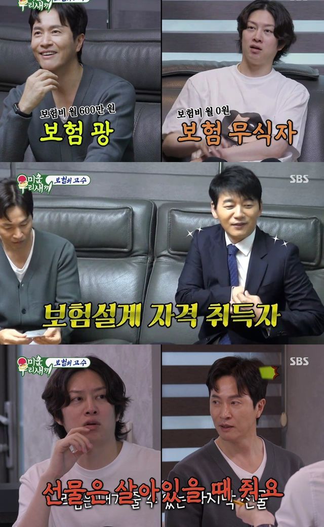 ‘연예계 대표 보험광’ 김정민의 보험 상태를 점검하기 위해 김승수가 나섰다. 30개의 보험을 들고 한 달에만 무려 600만 원을 보험료로 낸다는 김정민과 반대로, 국민연금과 건강보험만 가지고 있다는 ‘보험 무지랭이’ 김희철. 극과 극인 두 사람 앞에 보험 설계사 자격증을 3개나 취득한 김승수가 나타난 것. 김승수는 “나도 한때 보험료로 700만 원까지 냈었다”라고 밝혔다. 김정민의 보험을 하나하나 진단하던 김승수는 “왜 사망보험을 이렇게 많이 들었냐”라고 질문했고, 김정민은 “내가 늦은 결혼을 했고 아이들이 어려서 나중에 경제적 부담을 주기 싫었다. 내가 줄 수 있는 마지막 선물이랄까”라고 밝혔다.
