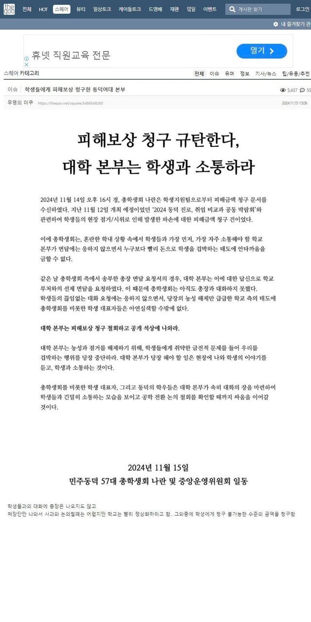 (3억3천 손배 관련) " 그러나 학교 측 관계자는 "당일 진로취업 박람회를 주최하고 준비했던 업체들이 기물 훼손 등에 대한 견적을 마련해 학교 측에 전달했고, 수신인이 '총학생회'로 돼 있어 총학생회 측에 전달한 것 뿐"이라며 "대학 본부가 청구한 것은 아니"라고 설명했다."