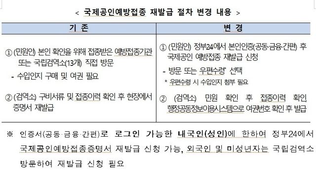 그동안 국제공인예방접종증명서를 분실·훼손했거나, 개인정보가 변경되는 경우 등의 사유로 재발급이 필요한 경우 민원인이 국립검역소(13개)나 예방접종을 받은 기관을 직접 방문해 재발급받아야 했다.
