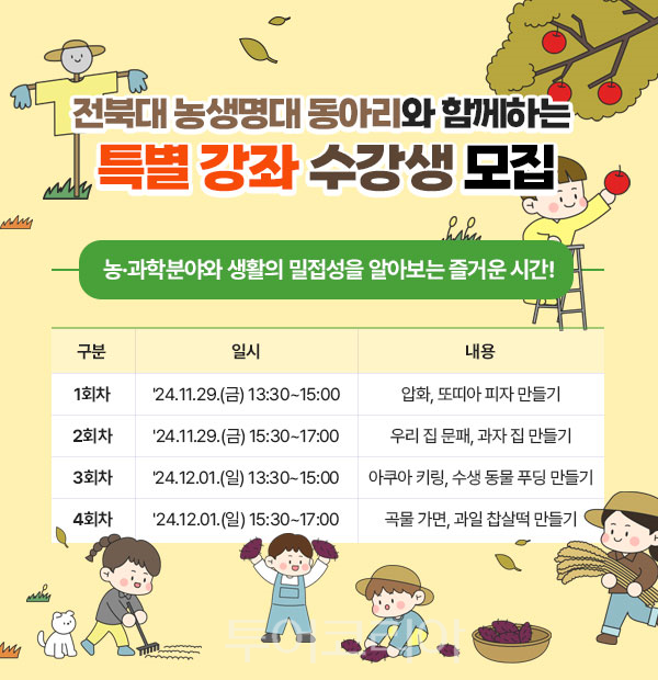 [투어코리아=김지혜 기자] 힐링이 필요하다면 전북특별자치도 어린이창의체험관으로 가보자. 어린이창의체험관은 오는 29일과 12월 1일, 전북대학교 농업생명과학대학 동아리 FBI(Farm Business Industry)와 협력해 특별 프로그램 '힐링체험의 날'을 운영한다.