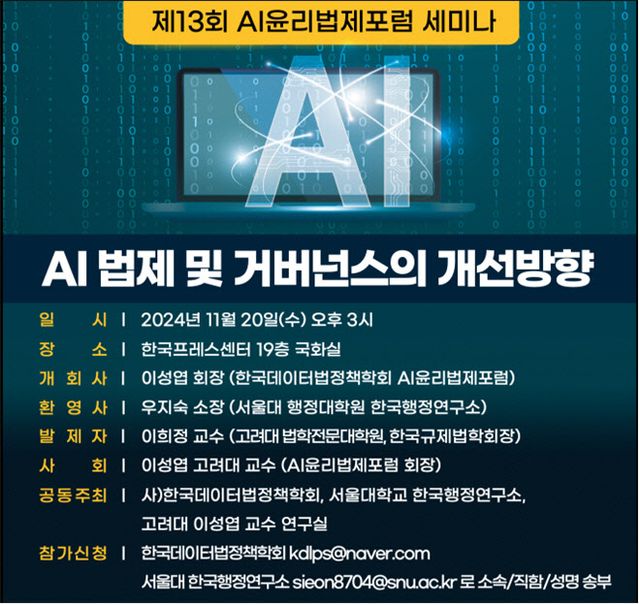 포럼 회장인 이성엽 교수는“지난 9월 국가인공지능위원회가 출범하고 22대 정기국회에서도 다수의 AI 법안이 발의되어 있는 상황에서 국내외 AI 법제와 거버넌스를 살펴보고 바람직한 개선방향을 살펴보는 의미 있는 세미나가 될 것”이라고 밝혔다.