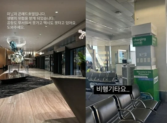 "마닐라 콘래드 호텔이다. 생명의 위협을 받게 됐다. 공항도 무서워서 못 가고 택시도 못 타고 있다"