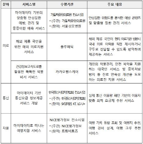 구체적으로는 △가톨릭중앙의료원 컨소시엄의 만성질환 위험도 분석을 통한 예방 콘텐츠 및 맞춤형 질환 관리 △룰루메딕의 해외에서 현지 의료기관 방문 시 국내 의료 기록 연동·번역 등 의료지원 △카카오헬스케어의 안전한 복약 관리·약물 처방 지원 △한국통신사업자연합회 컨소시엄의 실제 통신이용 패턴 기반 최적 요금제 추천 △나이스평가정보 컨소시엄의 맞춤형 여행지 추천·여행경비 최적 설계 제안 등 서비스 총 5건이다.