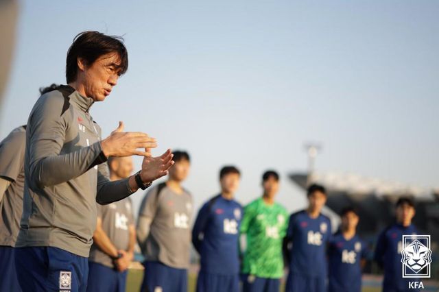 한국 축구대표팀 홍명보 감독이 지난 16일 오후(현지 시각) 쿠웨이트 자베르 알 아흐메드 국제 경기장 보조구장에서 열린 팀훈련에서 선수들을 향해 발언하고 있다. / 대한축구협회 제공-뉴스1