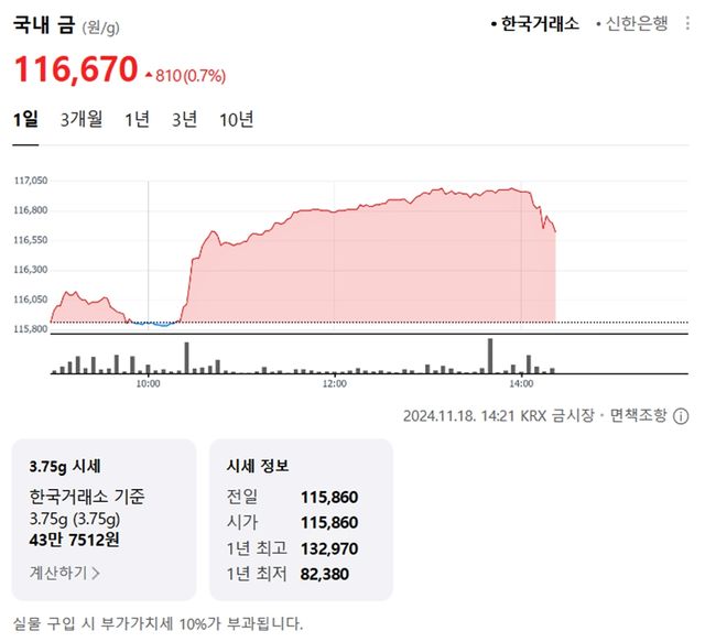 국내 금시세(금값)가 18일 오후 상승세(전 거래일 대비)를 보이고 있다.