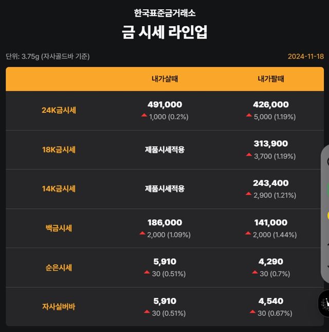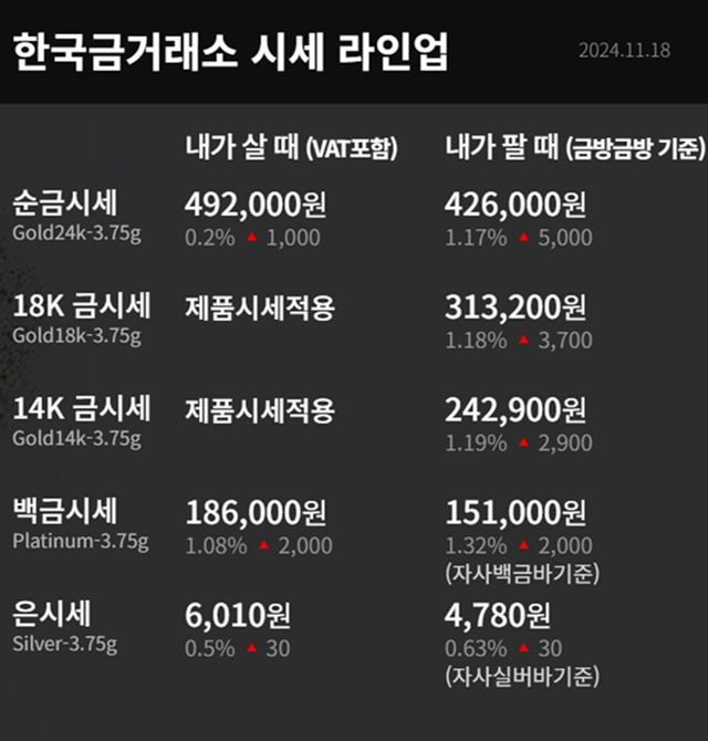 순금(24K) : 매입가 49만 2000원 / 매도가 42만 6000원