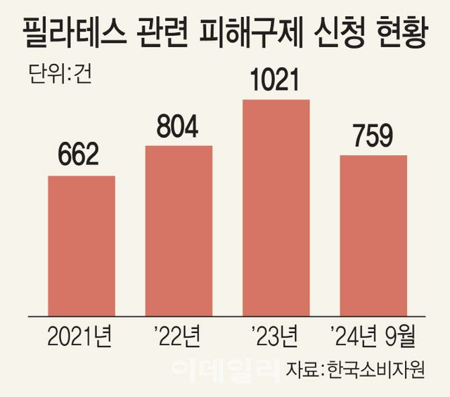 이 같은 사례의 요가·필라테스 관련 분쟁은 최근 급증세를 보이고 있다. 소비자원의 연도별 필라테스 관련 피해구제 현황에 따르면 2021년 662건이던 피해구제 건수는 2022년 804건으로 증가한 뒤 지난해 1021건에 달했다. 올해도 9월 기준 759건을 기록하고 있다.