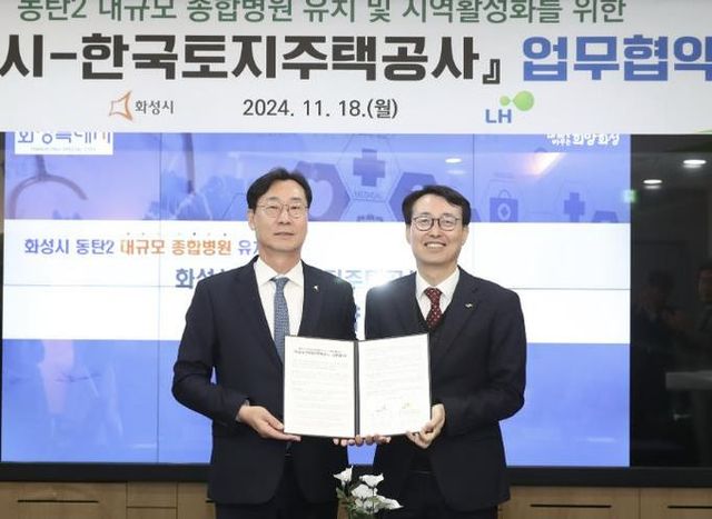 정명근 화성시장과 강오순 한국토지주택공사 경기남부지역본부장은 18일 시청 중앙회의실에서 화성시 동탄2지구 내 대규모 종합병원 유치 및 의료서비스 확충, 지역완결형 의료체계 구축·활성화를 위한 업무협약을 체결했다.