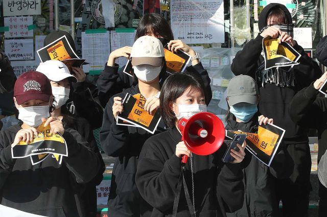 동덕여자대학교 제57대 총학생회를 비롯한 학생들이 15일 오후 서울 성북구 동덕여자대학교에서 기자회견을 갖고 학교측 피해보상 청구를 규탄하는 퍼포먼스를 펼치고 있다. 한편 동덕여대 학생들은 학교 측에 공학 전환 완전 철회를 비롯해, 총장직선제 등을 촉구하며 수업 거부 및 시위 등을 이어가고 있다. / 뉴스1