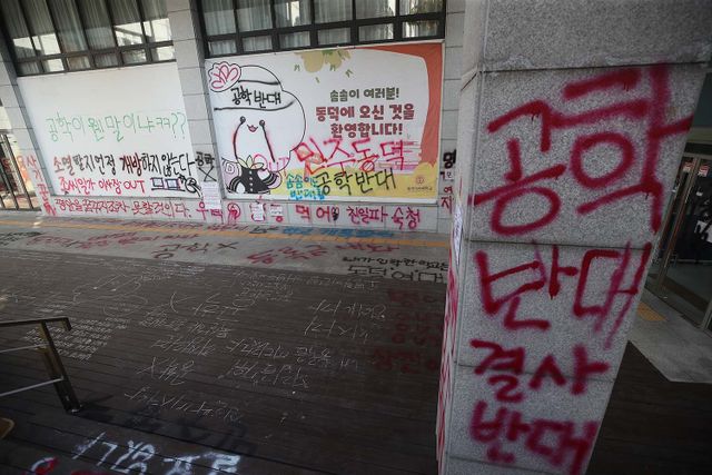 서울 성북구 동덕여대 캠퍼스엔 '소멸할지언정 개방하지 않는다', '공학 전환 결사 반대' 등 문구가 곳곳에 적혀 있다. 학생들은 수업을 전면 거부하고 백주년기념관 앞에 근조화환을 설치했다. 학생들 점거로 인해 '진로 취업·비교과 공동 박람회'가 진행되지 못했다.